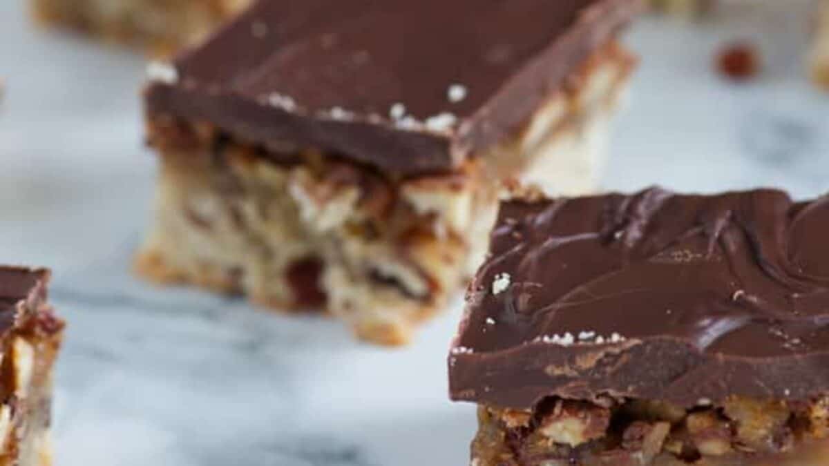Pecan Pie Bars are a simple dessert that has stood the test of time. With a buttery cookie crust and chocolate topping, you’ll never need to make pecan pie again.
