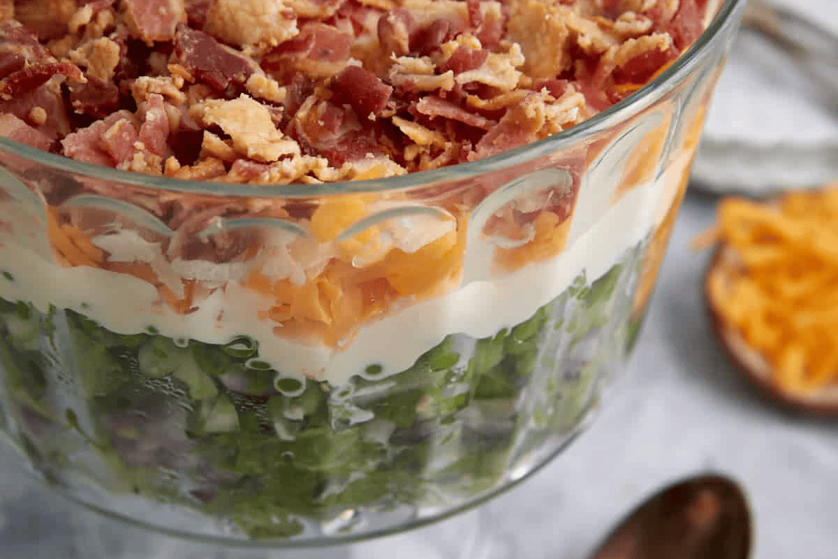 With its gorgeous rows of colors and bright flavors, this classic Southern seven-layer salad is the perfect make-ahead dish for family gatherings or a church potluck. Served in a clear glass bowl that showcases all the beautiful colors, this layered salad makes a gorgeous centerpiece to your dinner table.