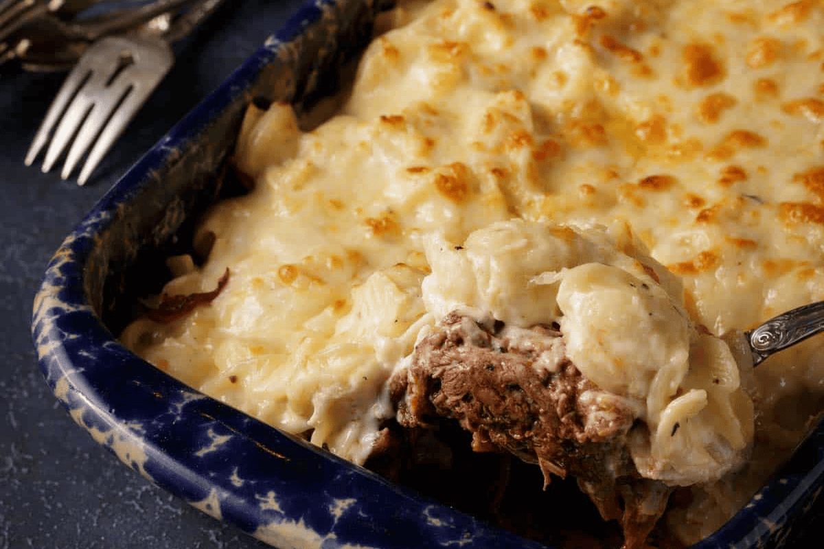 Oven-baked until brown-edged and bubbling, this creamy macaroni and cheese casserole has a bottom layer of tender, slow-cooked beef brisket! It’s a classic comfort food recipe packed with flavor, and super easy to make. A creamy, gooey homemade cheese sauce ties it all together!