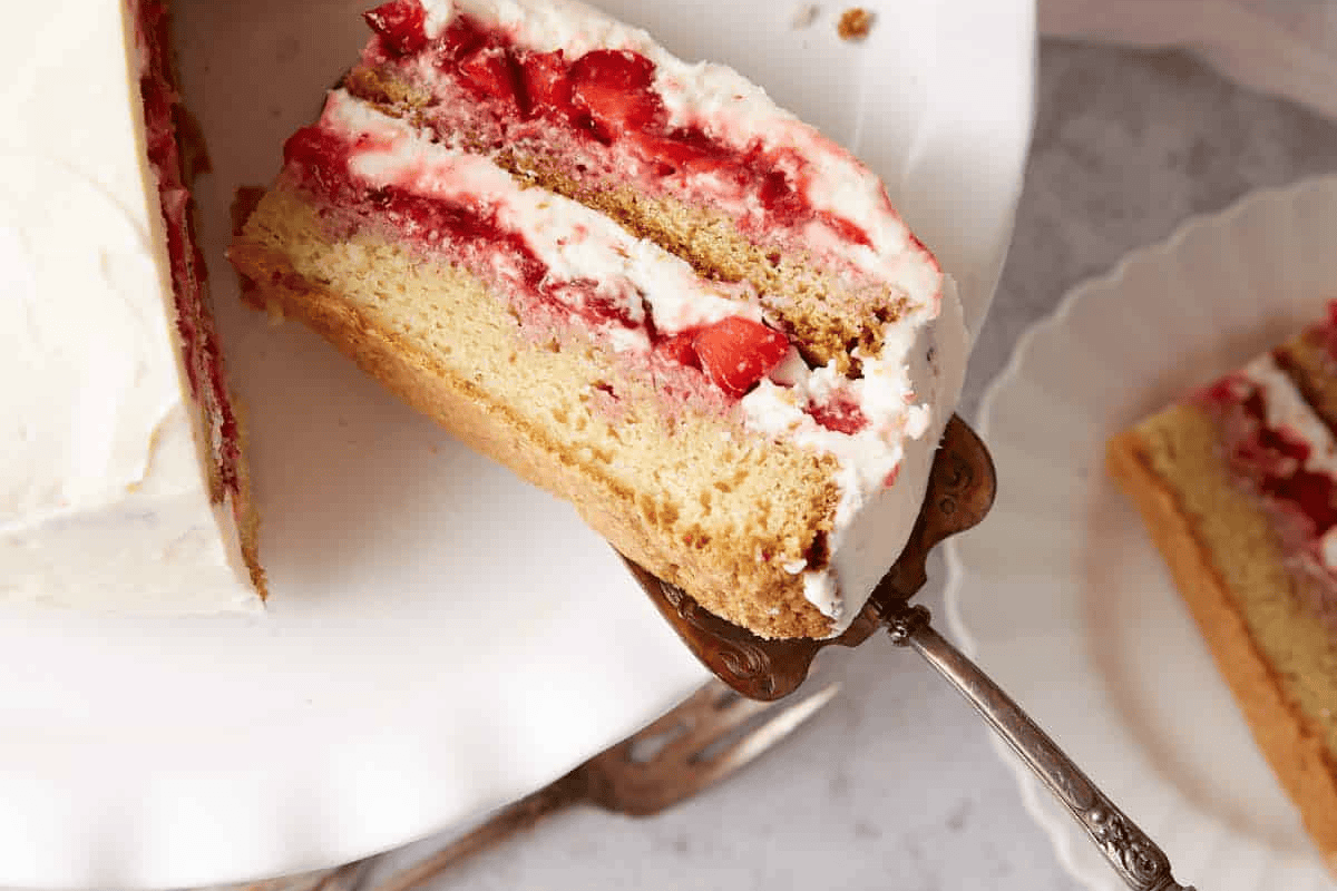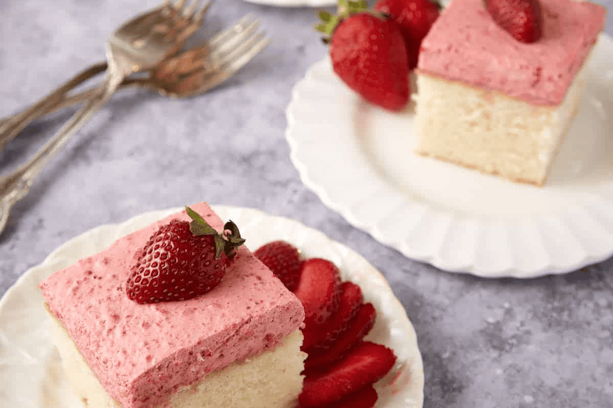 A cake topped with strawberry mousse is a fabulous way to showcase fresh strawberries. The creamy and airy texture of the mousse perfectly complements the moist vanilla cake. It’s not quite as sweet as frosting but still bursting with flavor.