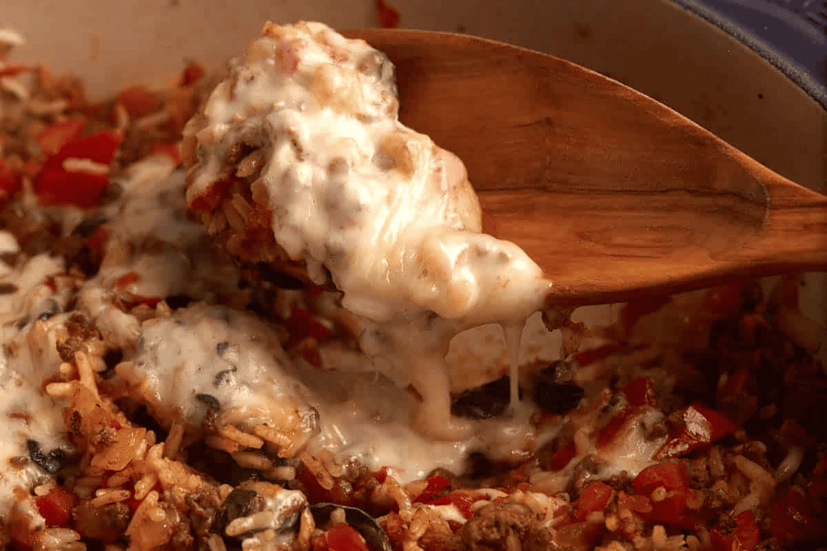 Hamburger rice casserole is a quick, delicious dinner that’s cooked entirely on the stovetop. This one-pot cheesy casserole is a flavor-packed supper your family will love, and you don’t even have to turn on the oven. No need to cook the rice, it cooks right with the ground beef.