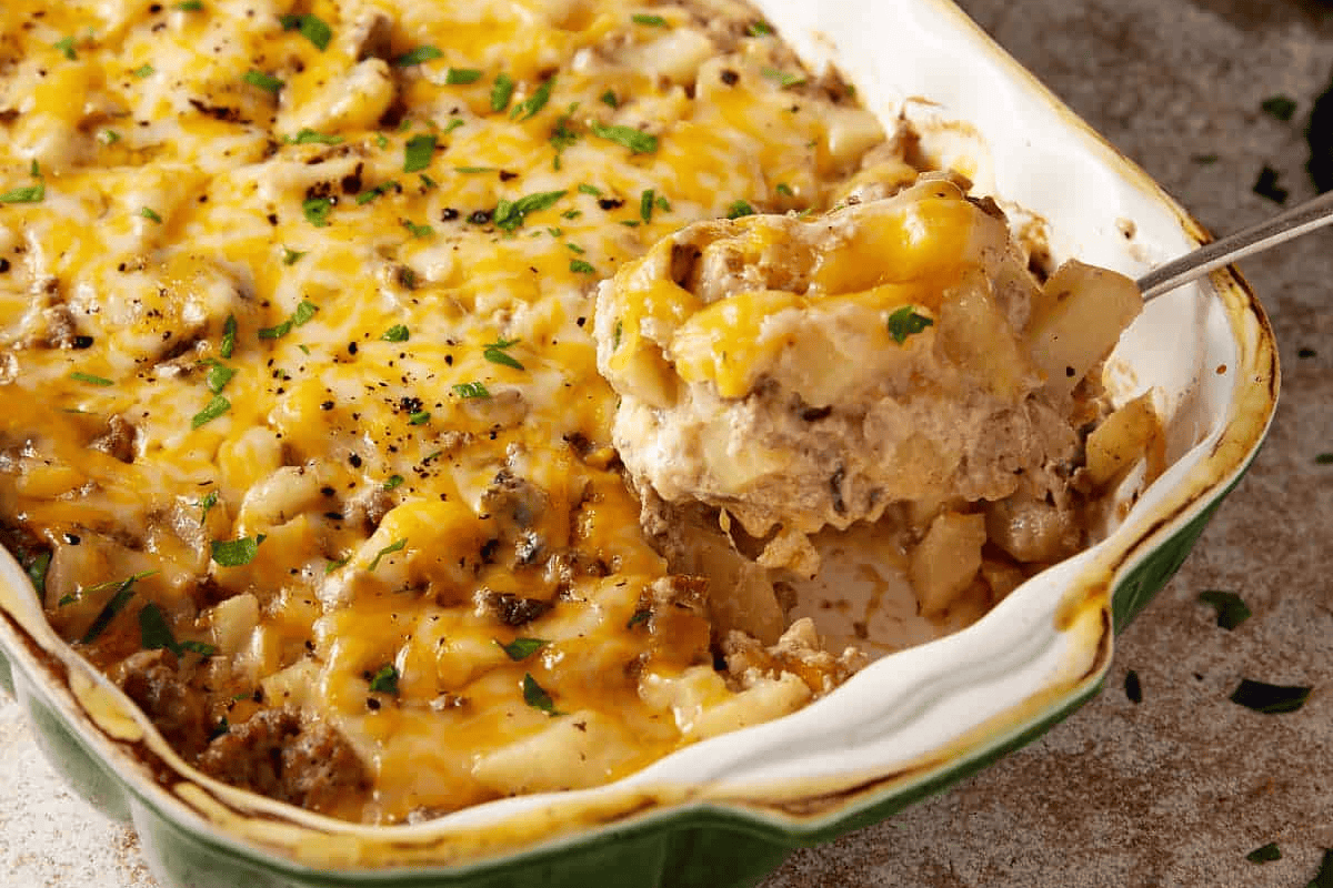 This hamburger and potato casserole is filled with everything you need for a delicious meal. Creamy potatoes with seasoned ground beef covered in cheese makes an ultimate comfort meal the whole family will love. No can of soup needed!