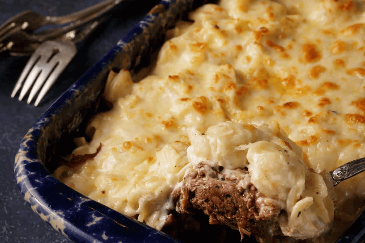 Oven-baked until brown-edged and bubbling, this creamy macaroni and cheese casserole has a bottom layer of tender, slow-cooked beef brisket! It’s a classic comfort food recipe packed with flavor, and super easy to make.