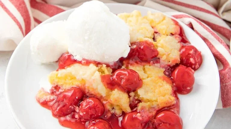 As delicious as it is easy to make, this Cherry Dump Cake is made with cherry pie filling, cream cheese, and a box of yellow cake mix.