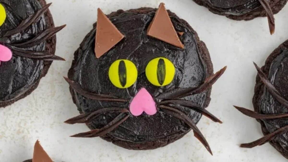 Bake festive Black Cat Cookies with a cake mix base and black cocoa frosting. Perfect for Halloween parties or a fun activity with kids!