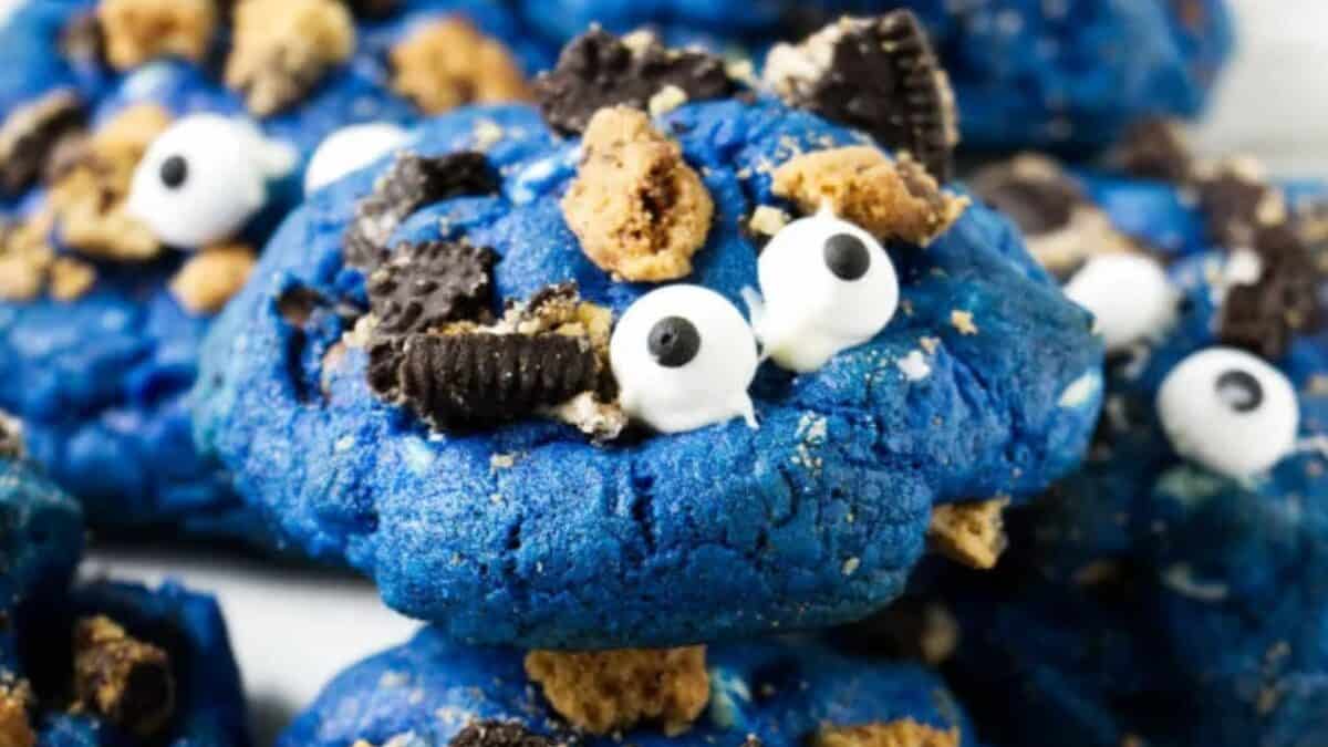 These blue Cookie Monster cookies are loaded with chunks of crushed cookies and chocolate chips then they get stuffed with more cookies.