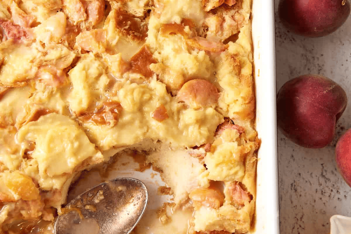 Peach Cobbler Bread Pudding with White Chocolate Sauce