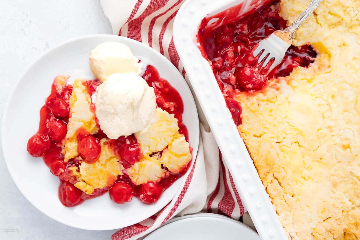 As delicious as it is easy to make, this Cherry Dump Cake is made with cherry pie filling, cream cheese, and a box of yellow cake mix.