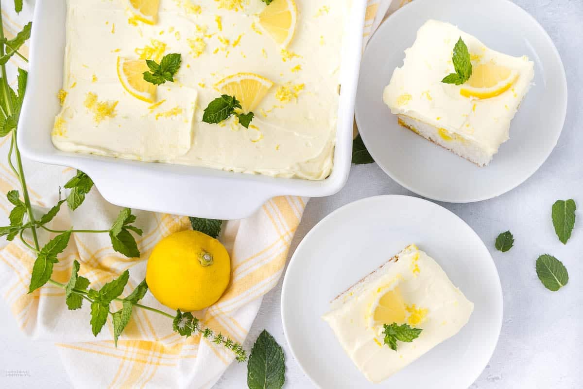 This sweet and citrusy Lemon Poke Cake has a delicious vanilla sponge base soaked with ribbons of lemon Jell-O and lemon Cool Whip frosting.