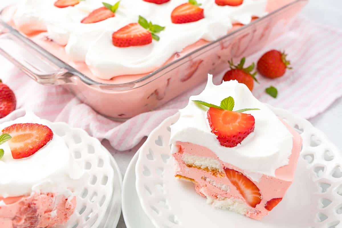 This Strawberry Angel Food Cake has all the classic flavors of strawberry shortcake with a layered fluffy jello twist.