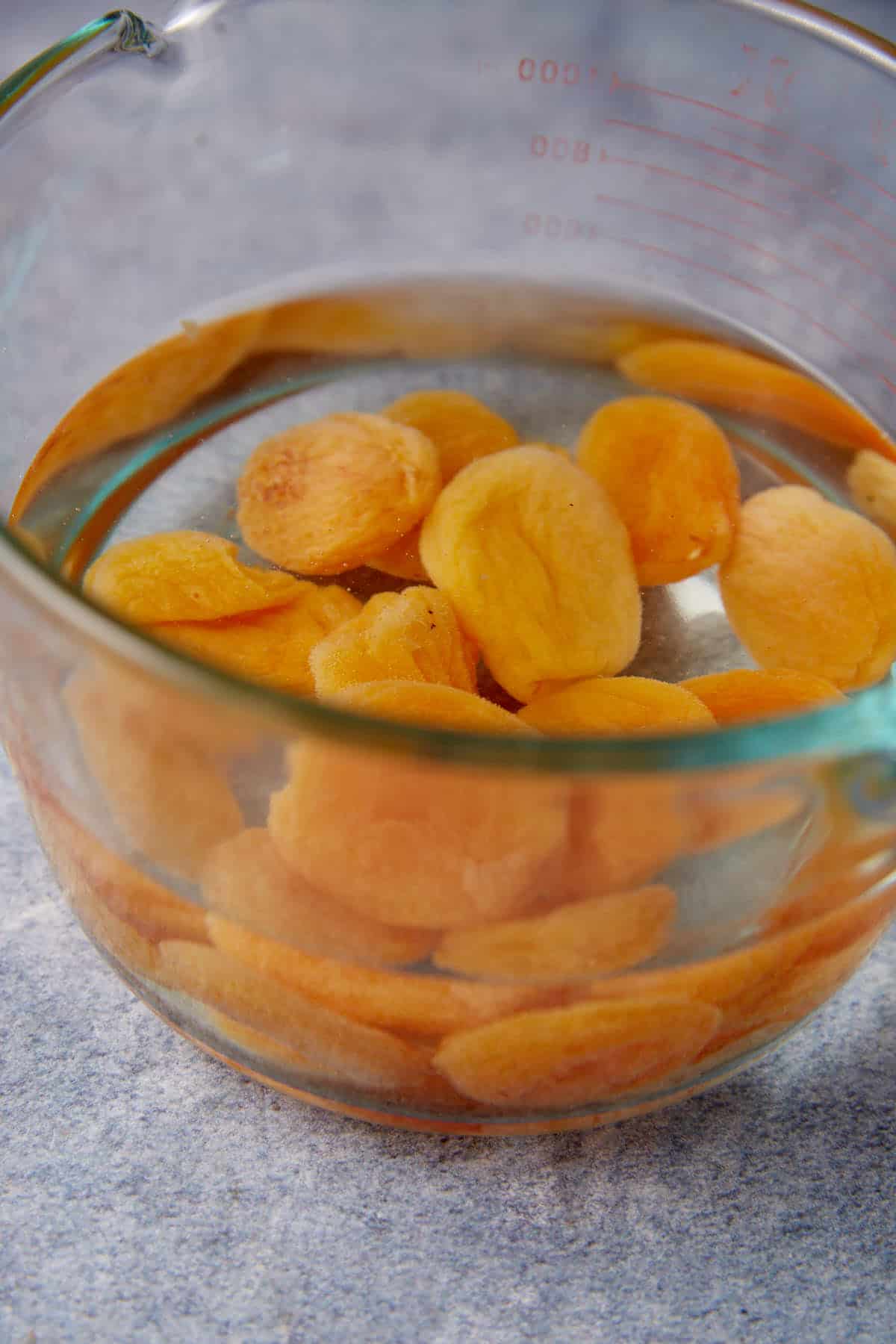 - In a medium sized bowl, pour hot water over apricots and set aside for 15 minutes until softened. Drain.