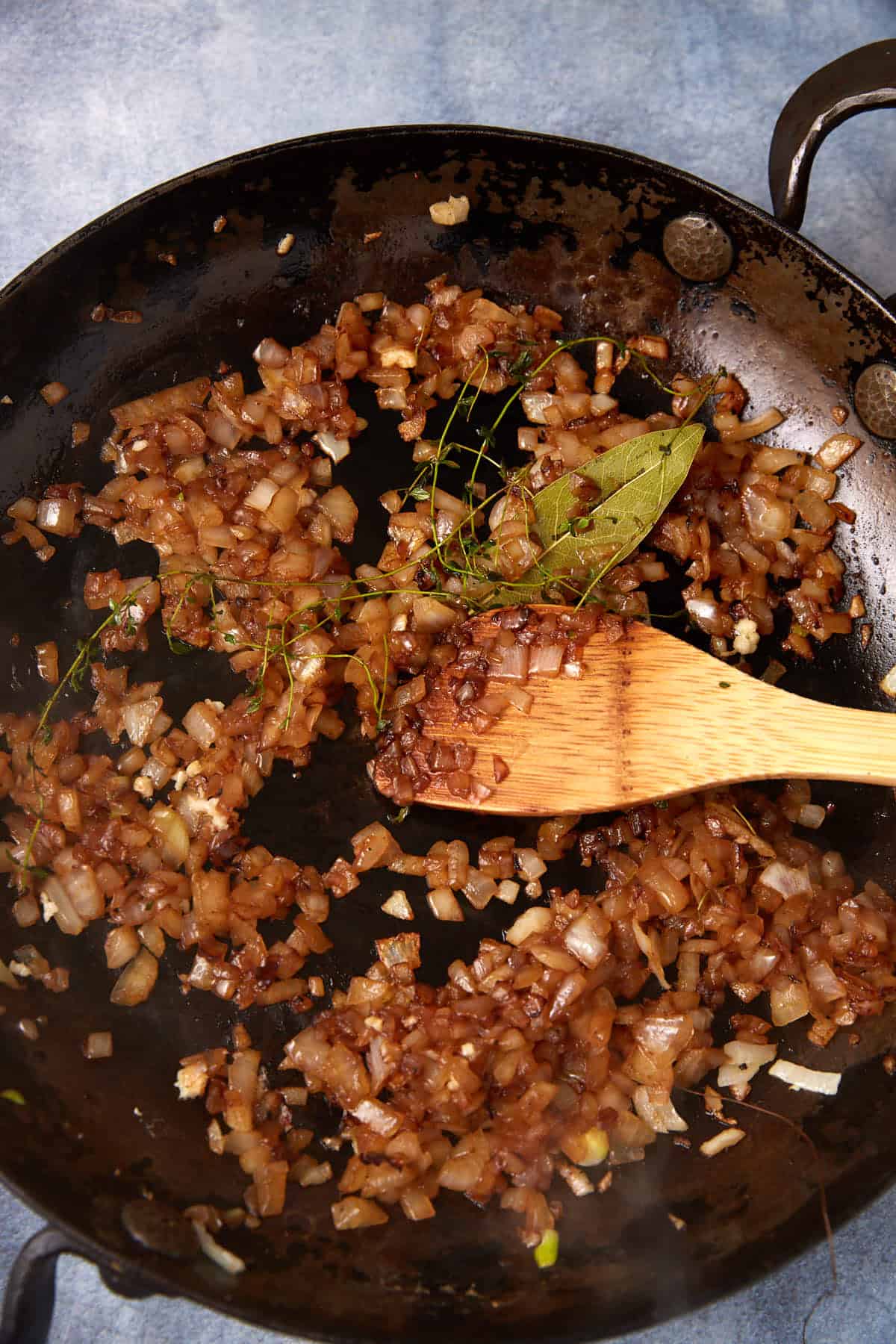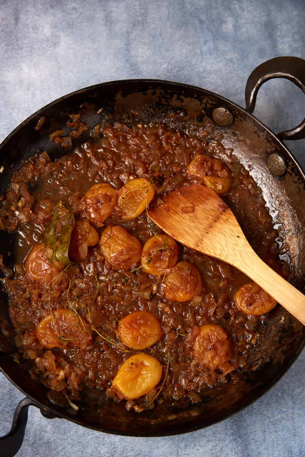In the same skillet, sauté onions with herbs until they’re soft and fragrant. Add garlic and a splash of wine, and scrape up those tasty bits from the pan. Toss in some broth, jam, and the softened apricots, then simmer until it thickens.