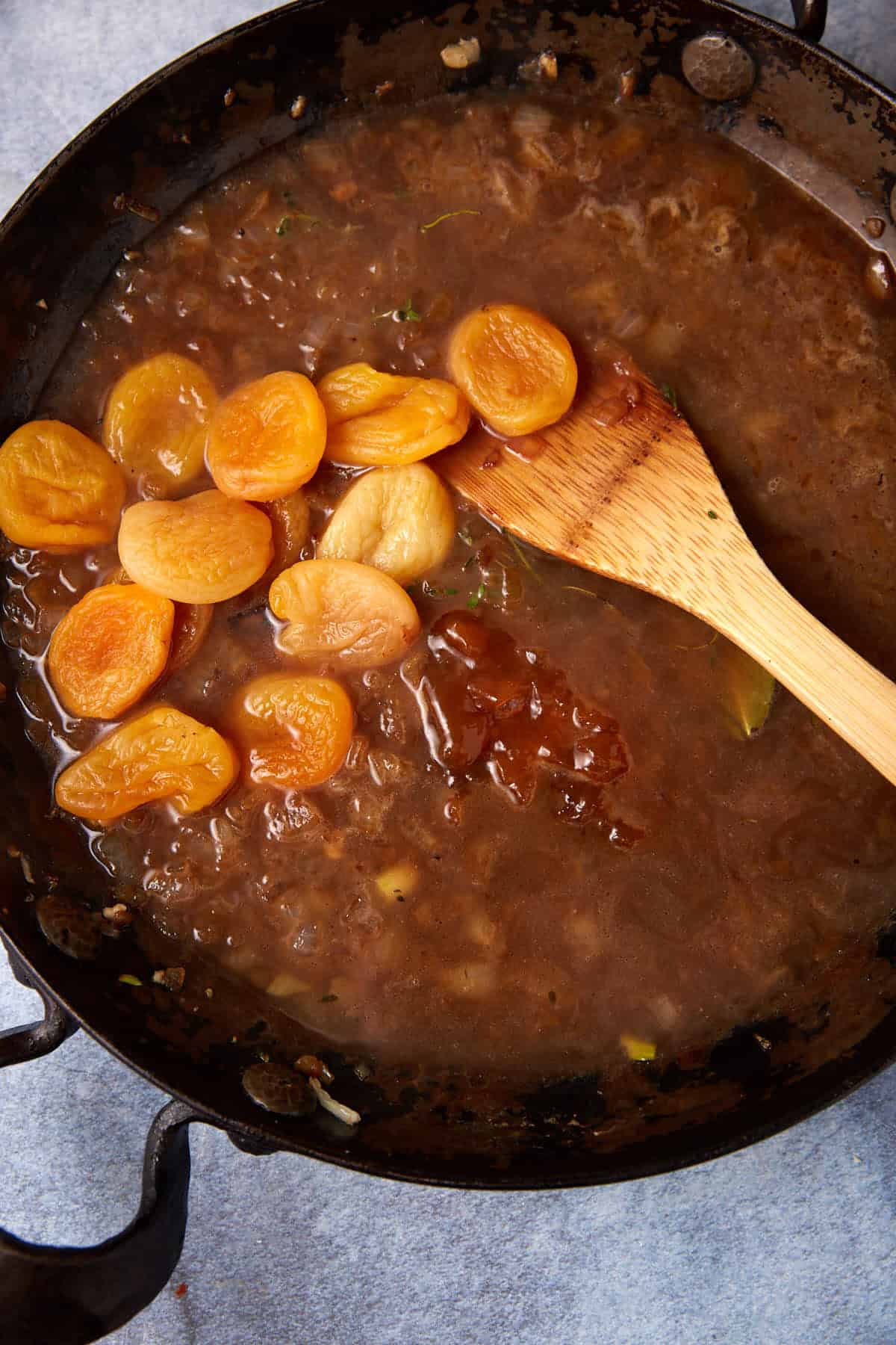 - Dried apricots and apricot jam: The dried apricots are soaked to soften them up a bit and add a wonderful texture to the sauce. The apricot jam adds a little sweetness, if you want it sweeter, you can add more.