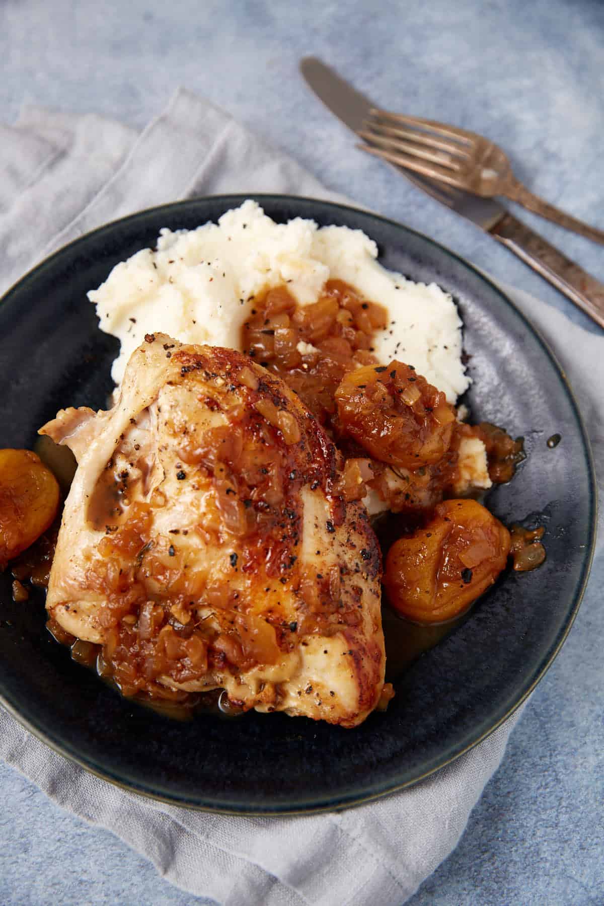 - It’s flavorful: The apricots paired with the sautéed herbs and aromatics create a savory, sauce that perfectly complements the chicken.