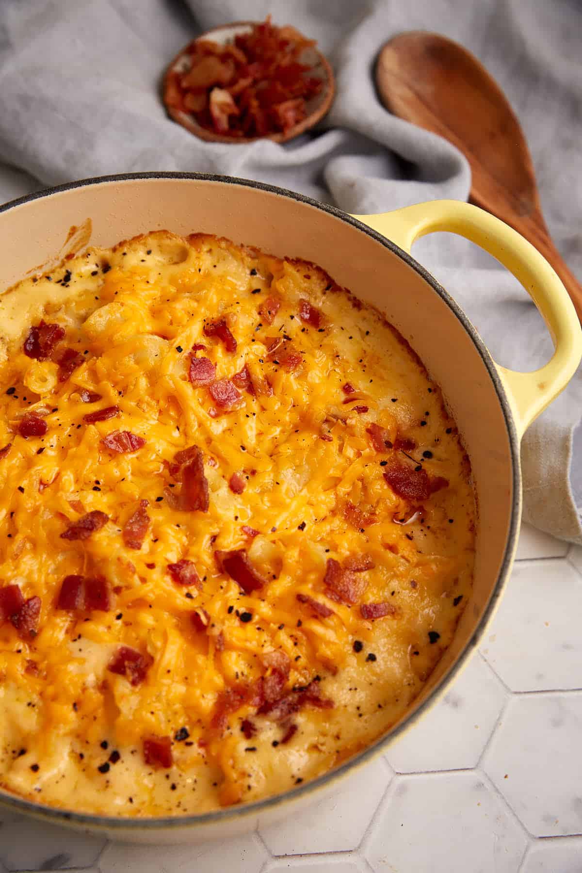 Pour the cheese sauce over the pasta and stir until coated. Place in a dutch oven, large skillet, or other baking dish and sprinkle some reserved bacon on top. (You can also add extra cheese here too!)