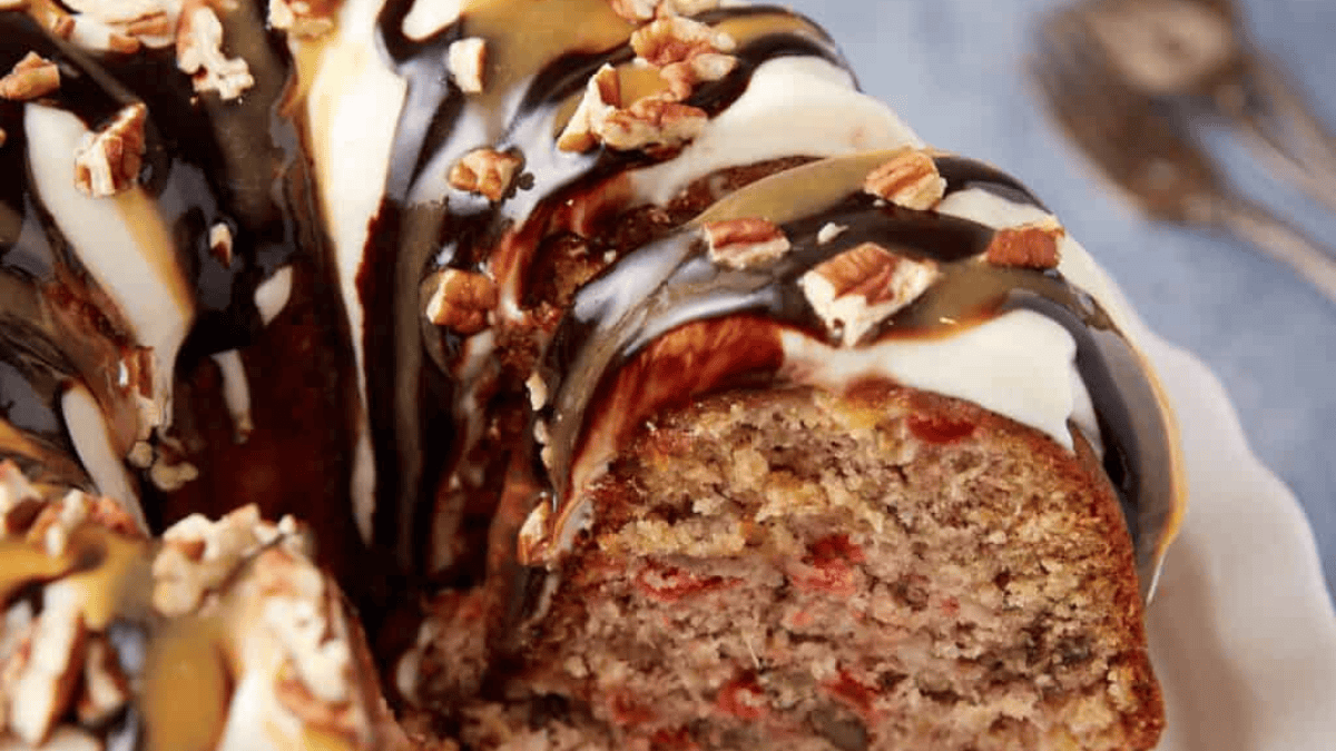 Whip up a tropical treat with this moist banana split bundt cake. It has pineapple, maraschino cherries, and pecans, topped with pineapple cream cheese frosting.