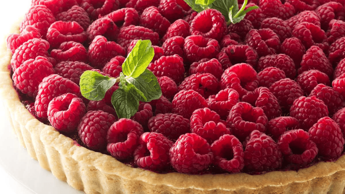 Our chocolate raspberry tart has a creamy chocolate and raspberry filling that’s topped with a sweet raspberry sauce and fresh berries.