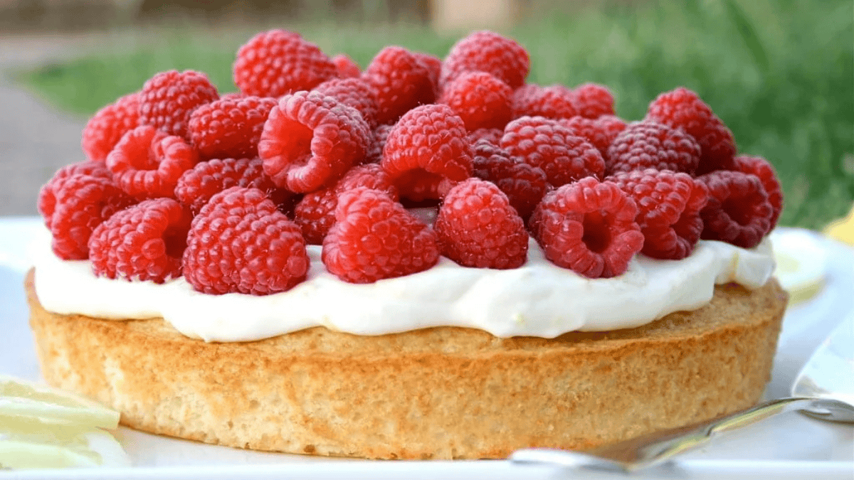 This Lemon Raspberry Cake is lightly sweet, has a hint of lemon flavor, and is topped with raspberries.