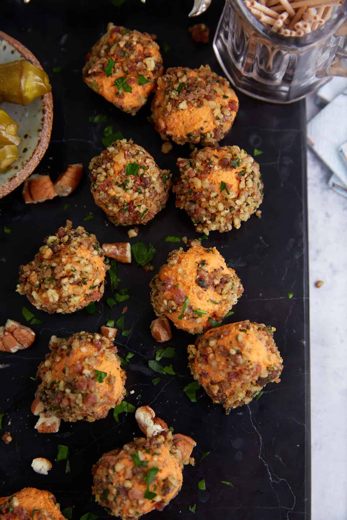 I like to serve these with sweet pickles on the side to cut the richness of the cream cheese balls, but you don’t have to stop there. Serve it alongside fresh ingredients like bell peppers and celery sticks, and even though you don’t necessarily need them, a side of buttery Ritz crackers are always delicious with a party cheese ball.