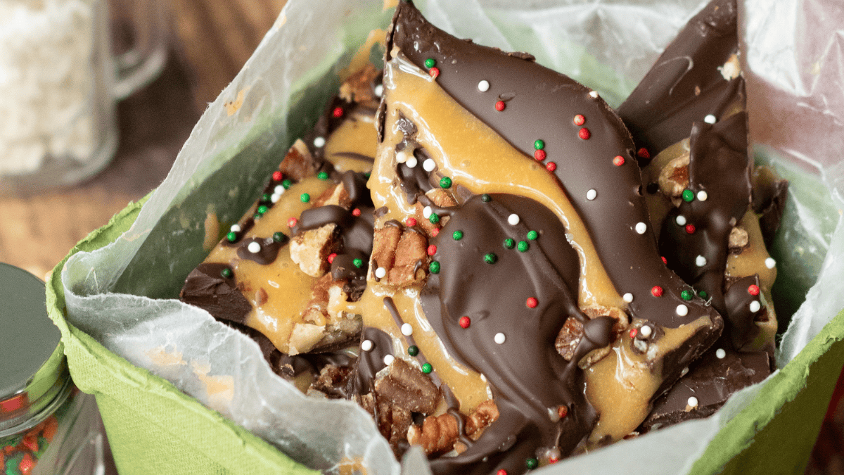 Graham Cracker Toffee Bark is easy to make and great for an edible gift. The sea salt and pecan finish make this a decadent treat.