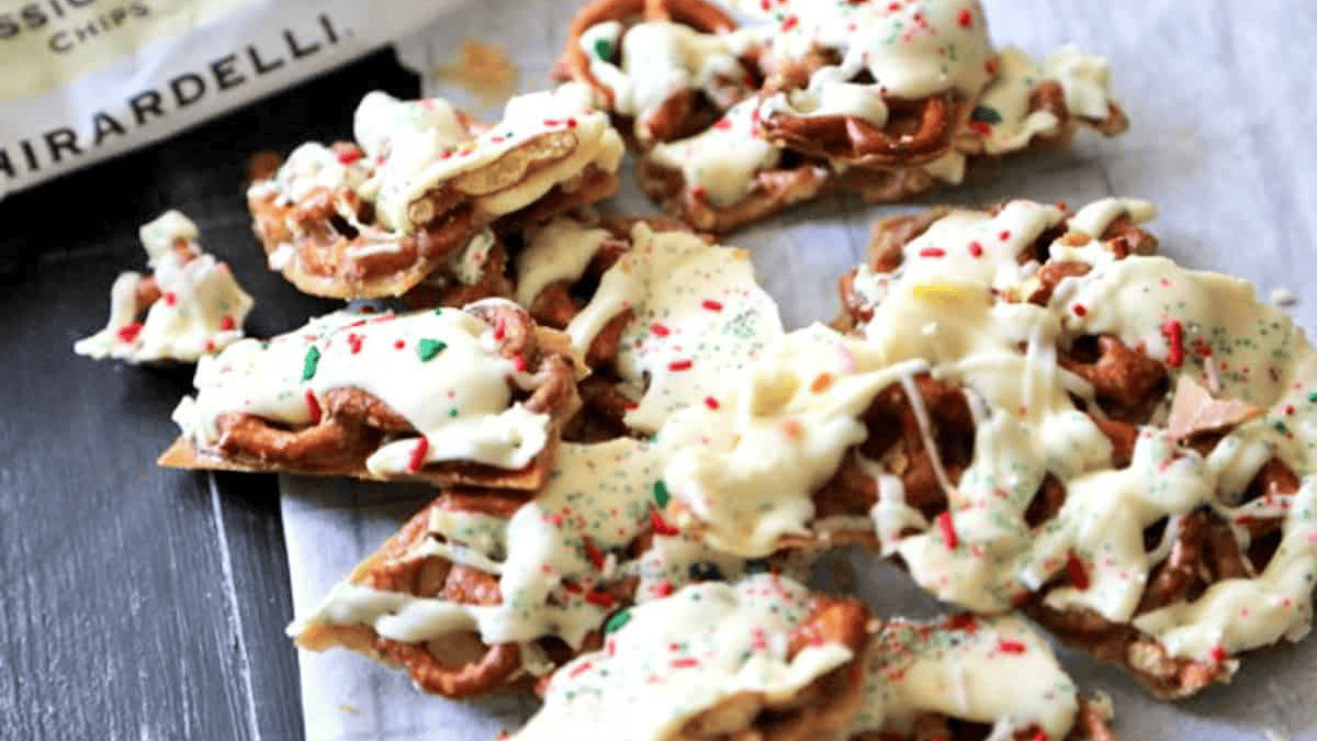 White Chocolate Pretzel Bark is an irresistible treat with salty pretzels covered in toffee and white chocolate.
