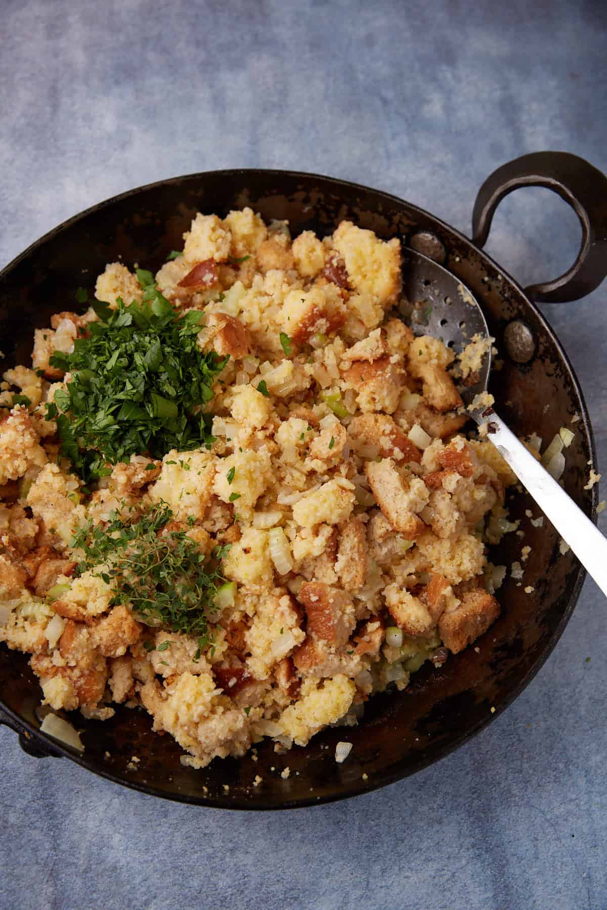 - In a large skillet melt 2 tablespoons of butter over medium heat. Add onions and celery and cook until softened, about 6 minutes. Gently add the cornbread mixture. Melt the remaining butter in the microwave and pour over the mixture. Add parsley and thyme and gently stir to mix together. Salt and pepper to taste.