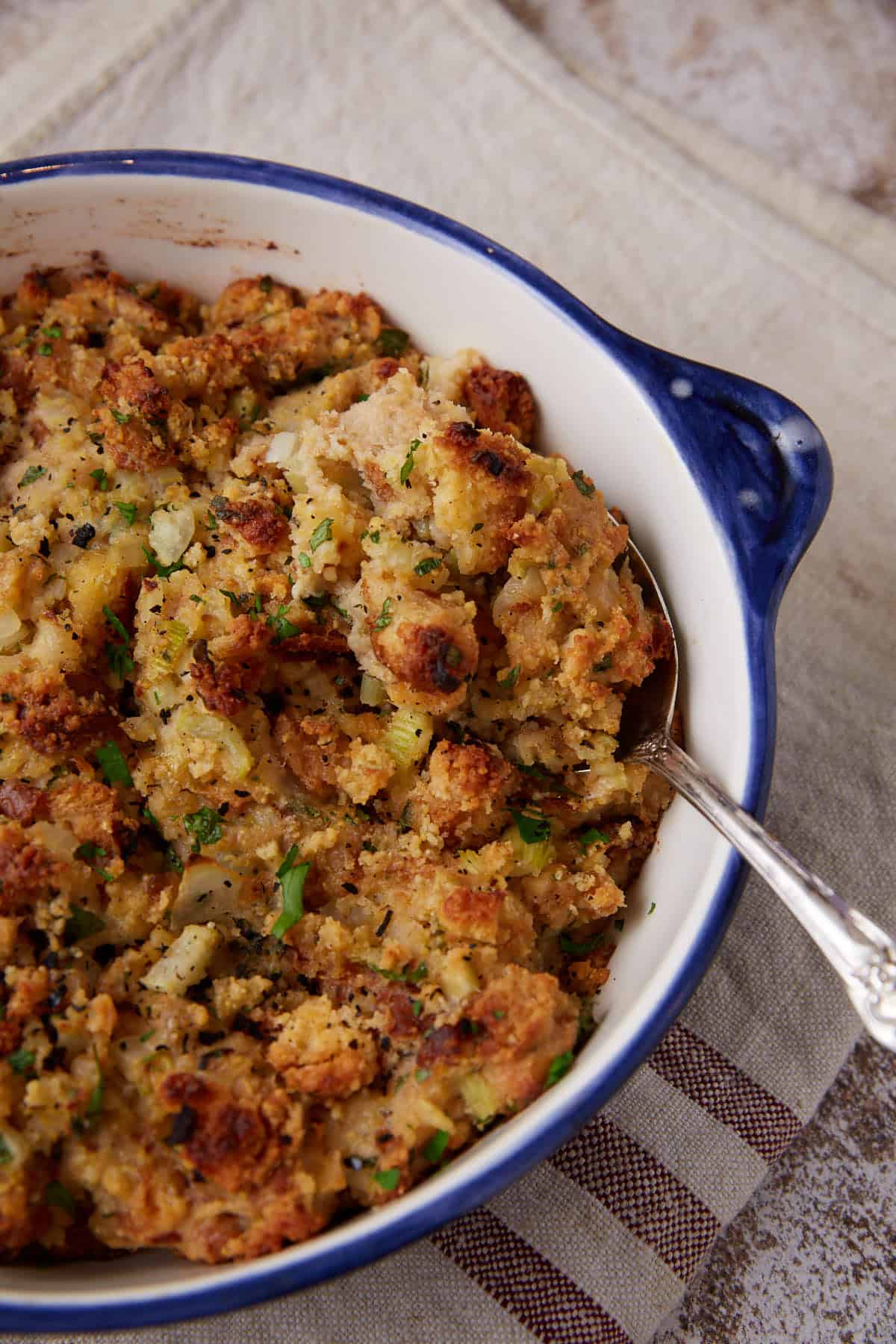 I’ve tried plenty of variations over the years, sausage, even oysters once, but I always circle back to this one. It’s simple, buttery, never dry, and the kind of side dish that gets everyone sneaking bites straight from the pan. Around here, we serve it right alongside green bean casserole (no canned soup!) and buttery yeast rolls and of course douse it in turkey gravy. Comfort food at its finest.