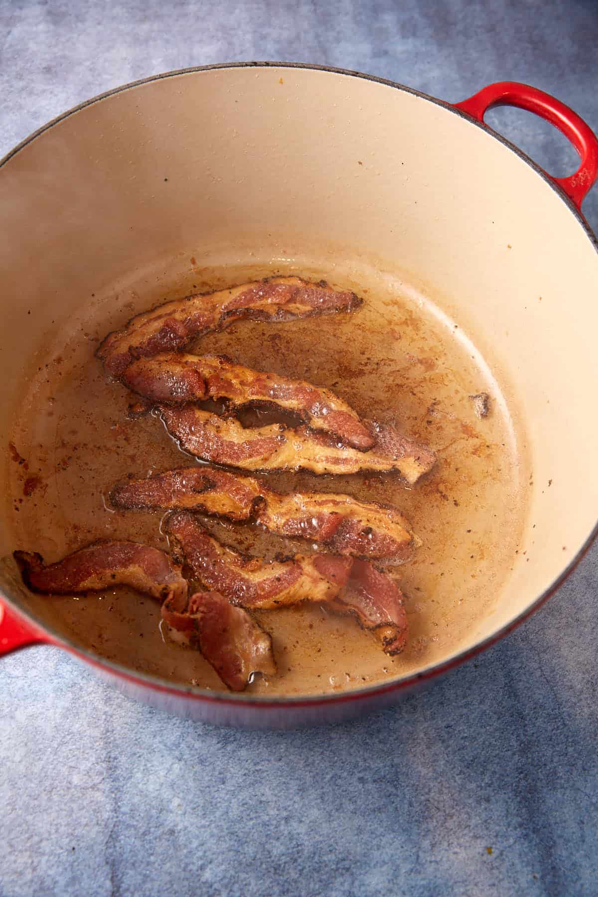 - Cook the bacon in a Dutch oven until crispy. Remove to a paper towel lined plate. Drain all but 2 tablespoons of bacon grease. Crumble the bacon once cooled.
