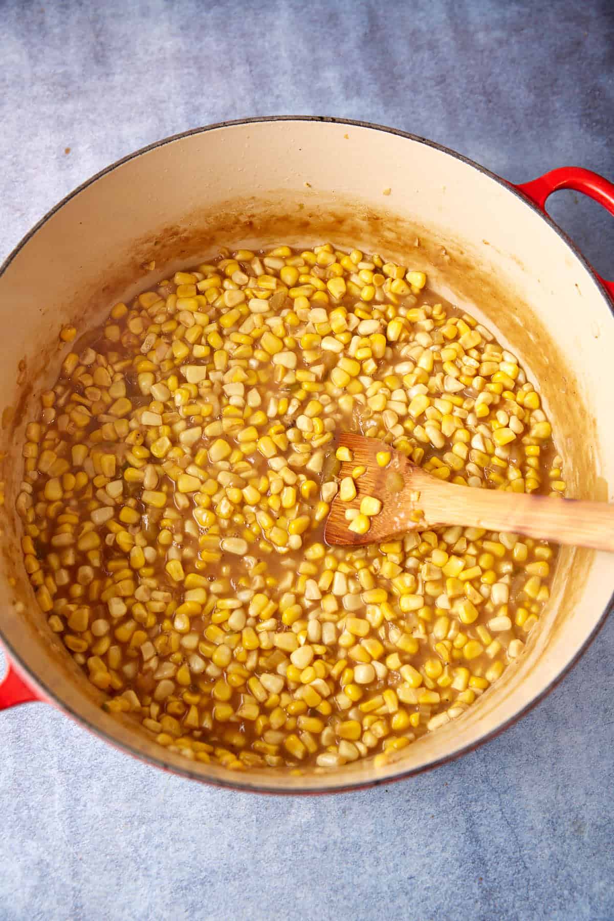 - In a large bowl, whisk the flour with the chicken broth until the flour has dissolved. Add to the onion mixture. Add corn and bring to a boil. Reduce heat to low and simmer for about 35 minutes until the corn has softened, stirring occasionally.