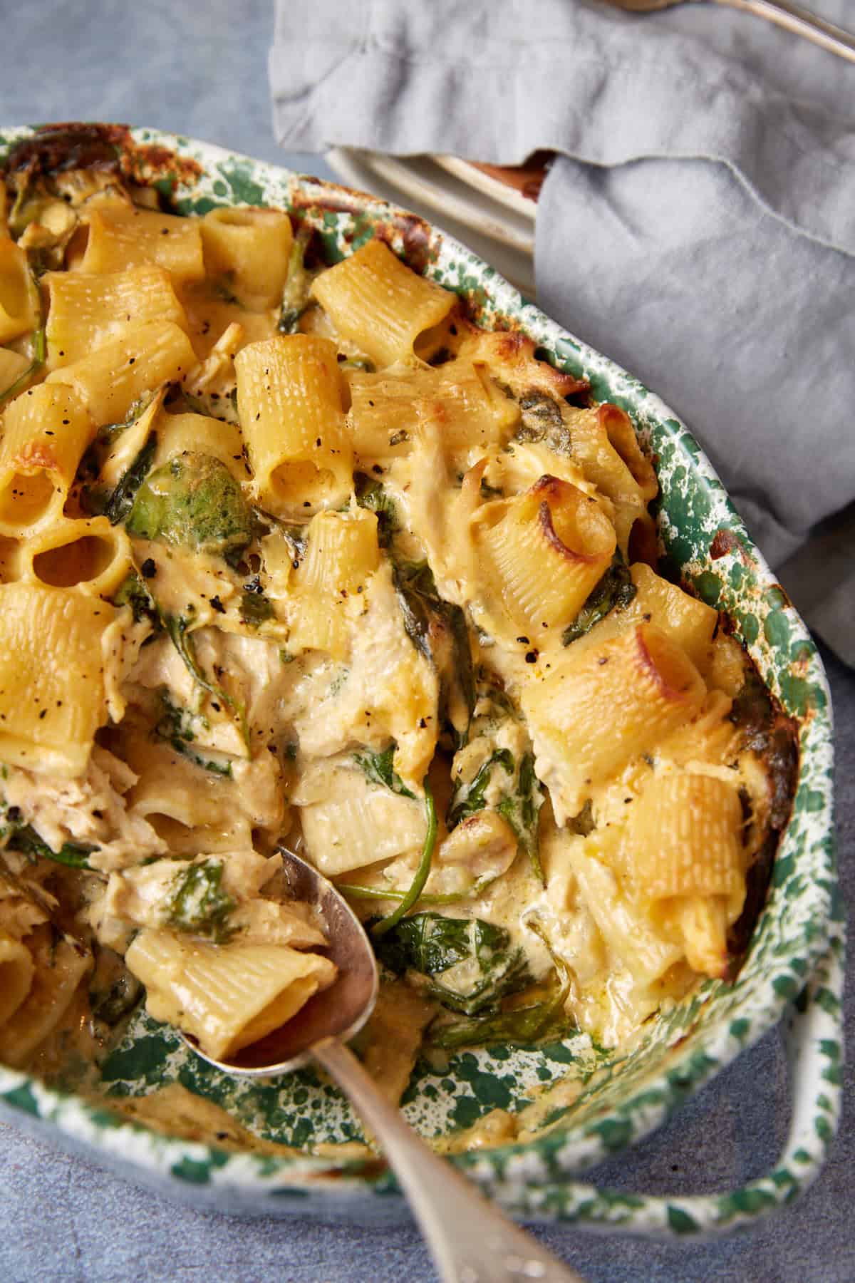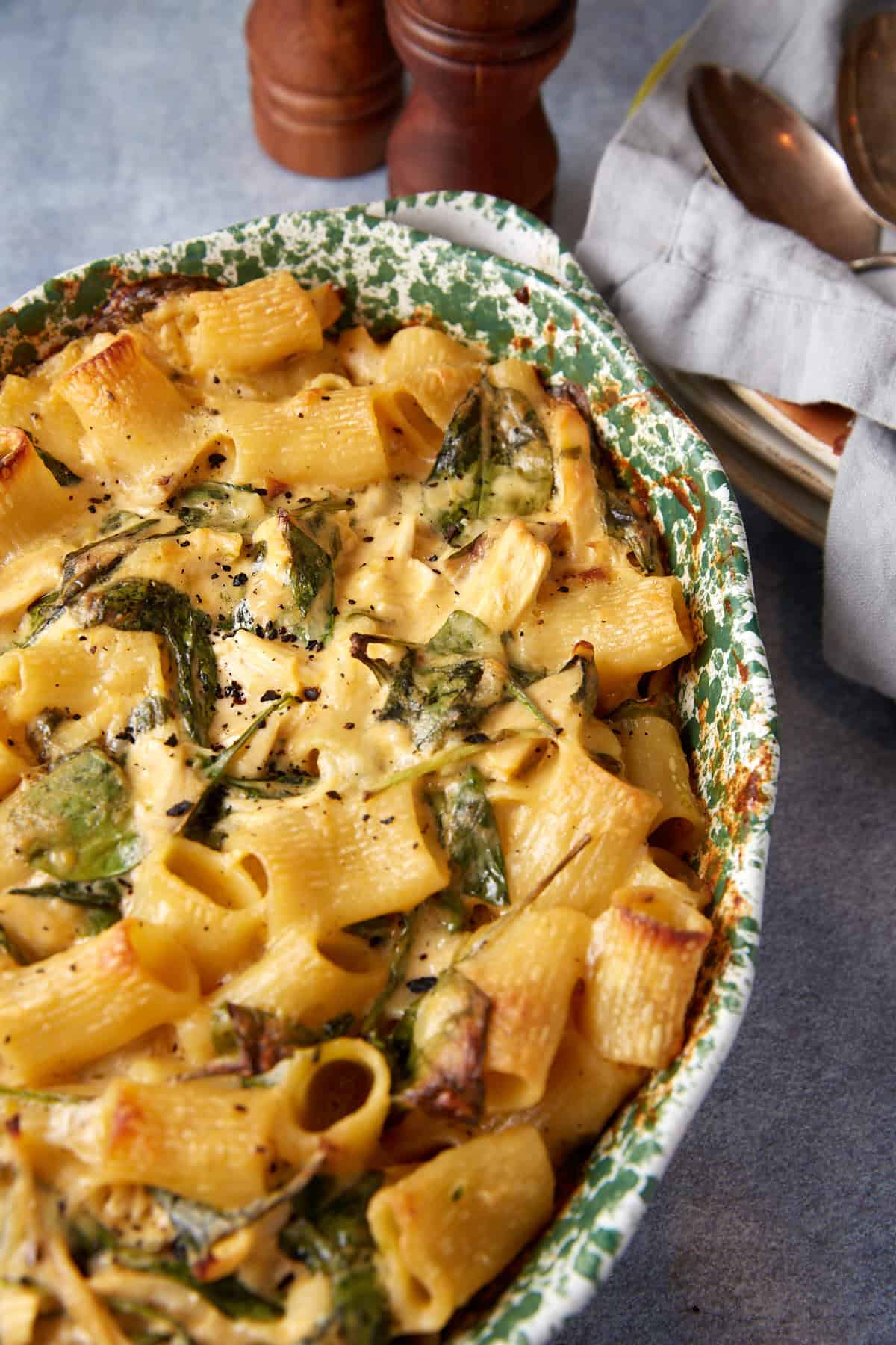 There are nights when all I want is a pan of something bubbling and cheesy, nothing fancy, just pure comfort. That’s when I pull out this spinach and chicken mac and cheese. It’s not quite your typical baked mac and cheese. With added protein and spinach it’s an entire meal.