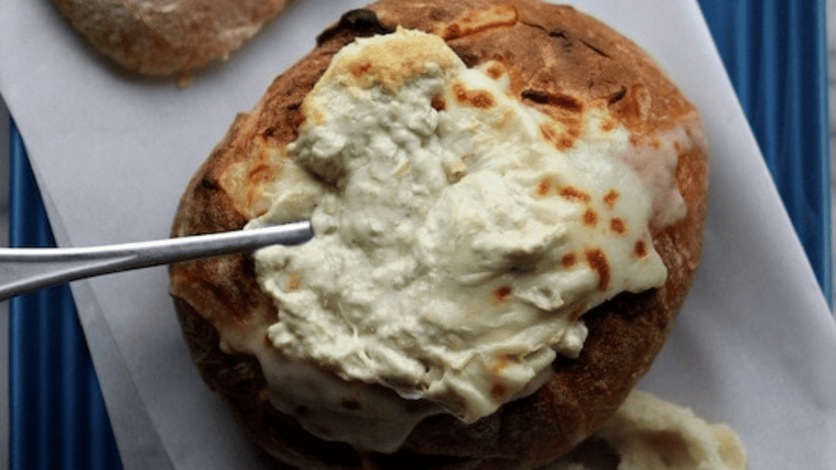 Get the Recipe: Hot And Cheesy Jalapeno Artichoke Dip In A Bread Bowl