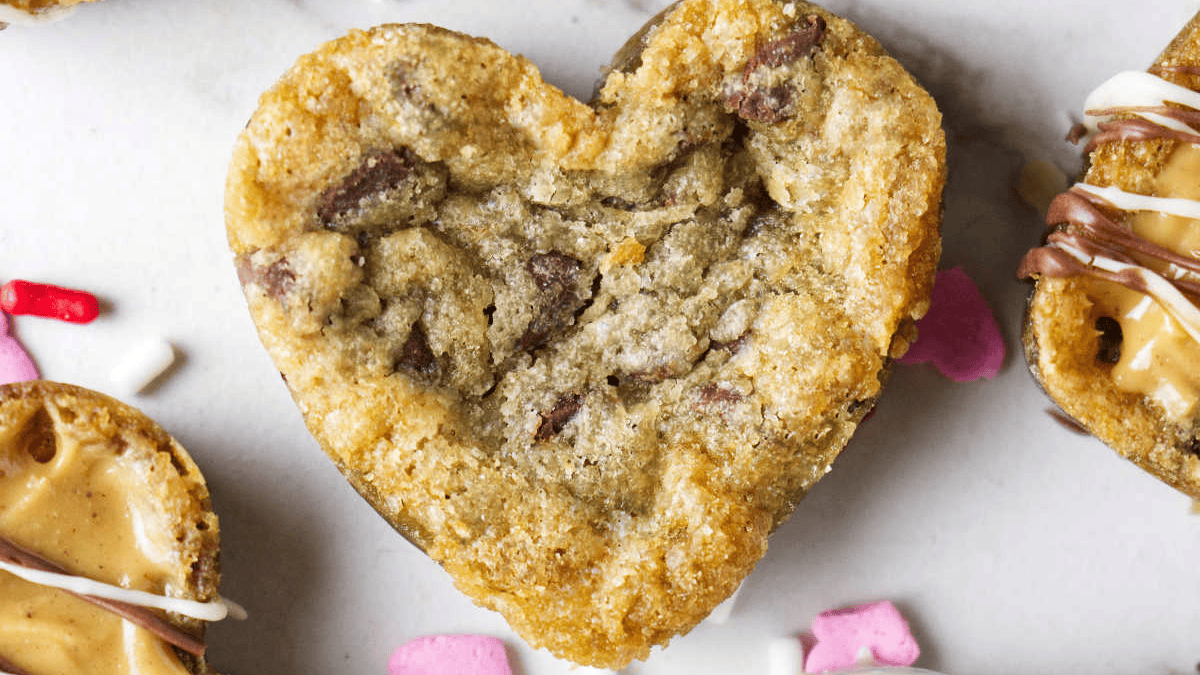 Heart shaped chocolate chip cookies are a fun, sweet treat for Valentine’s Day and you can decorate them with your favorite toppings!