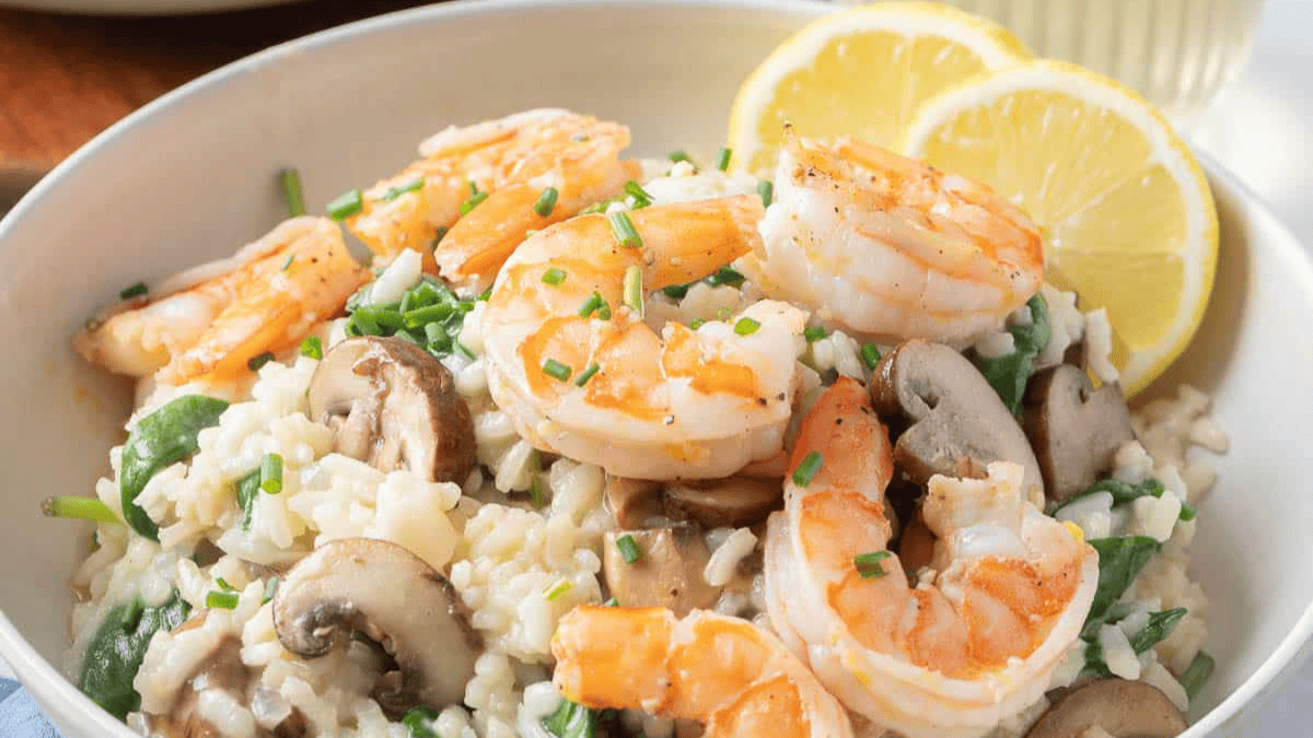 Creamy shrimp risotto made with Arborio rice, savory mushrooms, spinach, and Parmesan cheese. A foolproof recipe ready in 40 minutes!