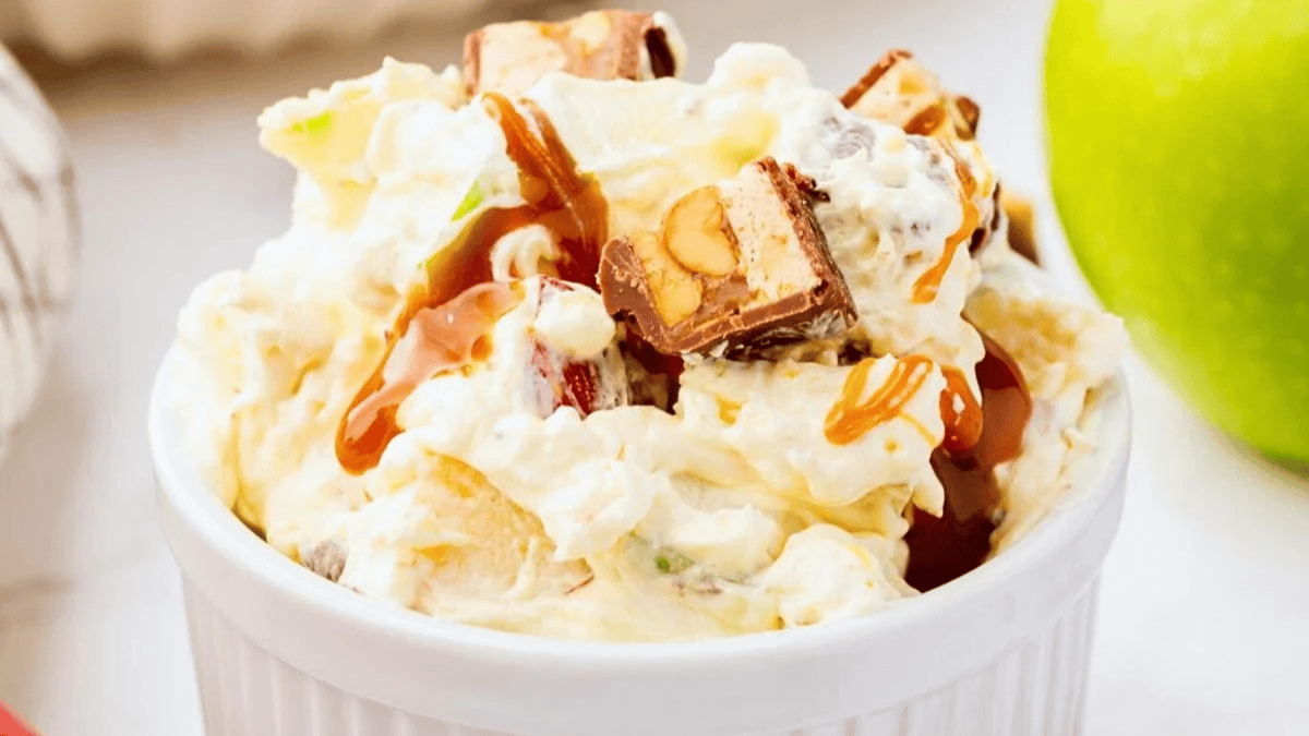 Apple Snickers Salad is a sweet and creamy salad dessert that combines crisp apples, crunchy Snickers bars, and a dreamy whipped topping.