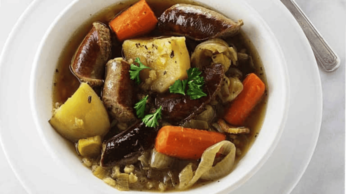 A Dublin Coddle is a rich, comforting and humble Irish stew of pork sausage, vegetables and herbs. Serve with Irish soda bread and a can of Guinness beer for the best Irish experience at home.