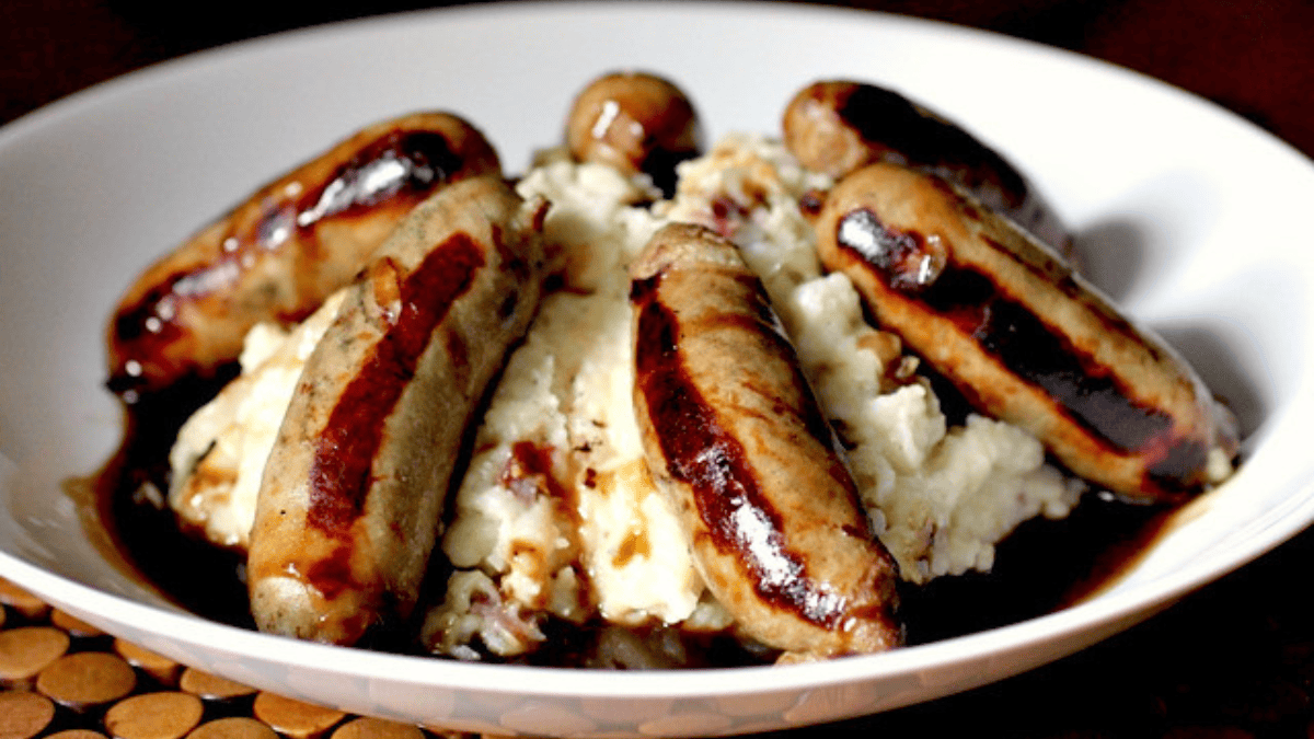Bangers and Colcannon: Classic, cozy Irish food with Guinness-braised sausages and mashed potatoes mixed with sauteed cabbage.
