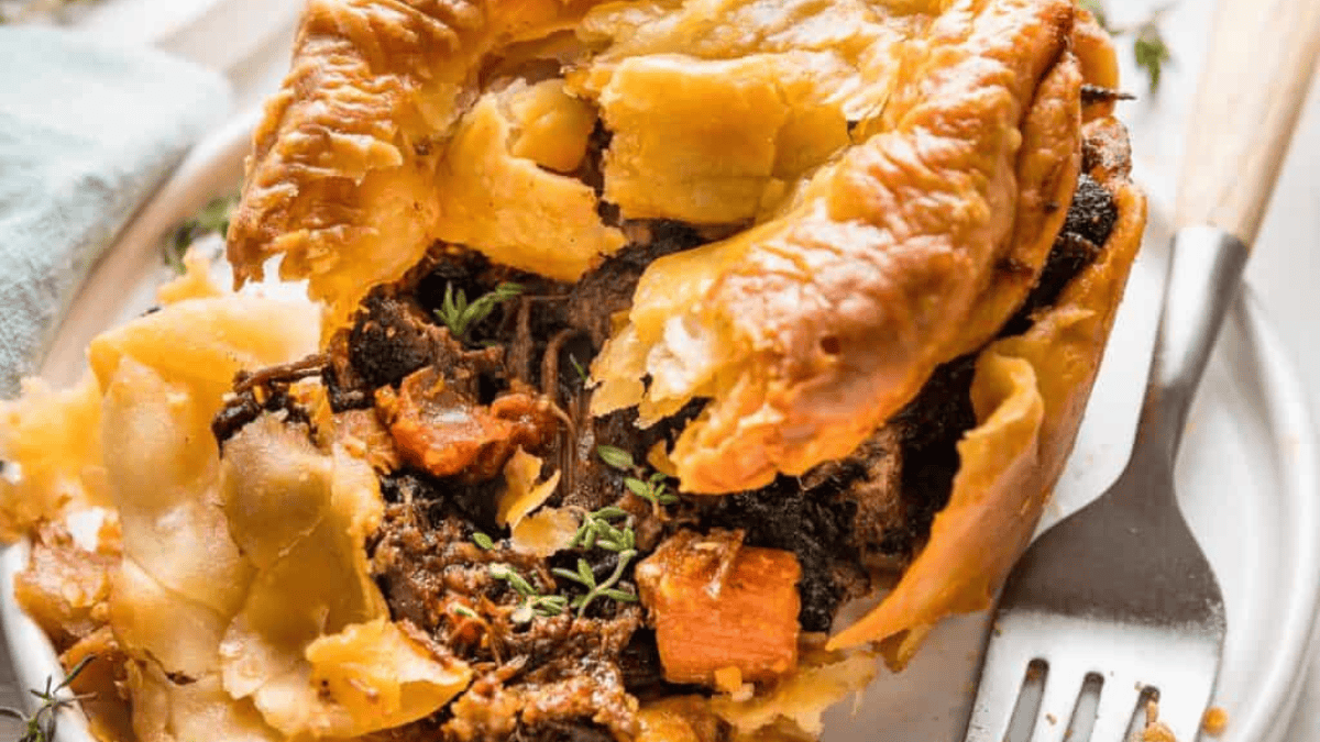 Individual savory Irish beef and stout pies, topped with puff pastry. The thick, rich sauce is made from beef stock, onions, mushrooms and dark stout beer.