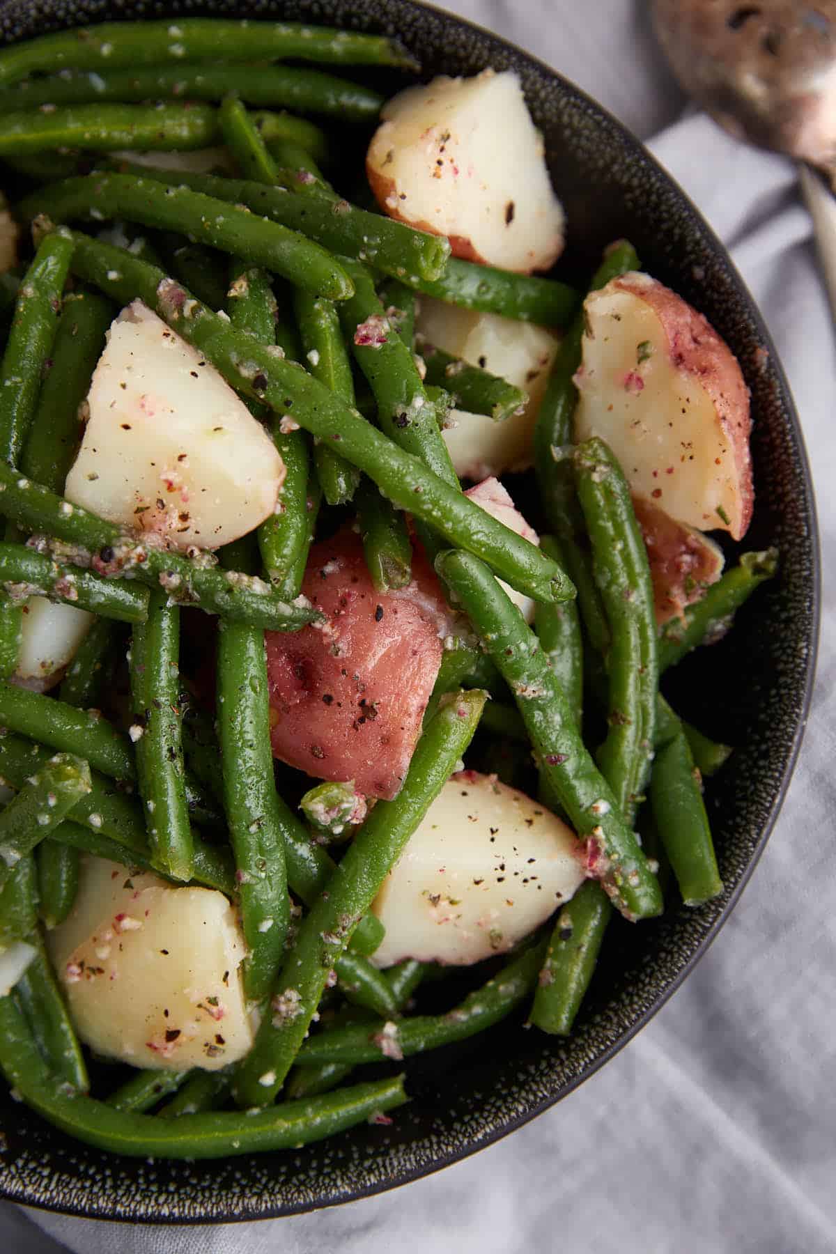 - The Perfect Bite – By blanching the green beans, you get that summer bright color and crisp-tender green beans that hold up beautifully to the dressing.