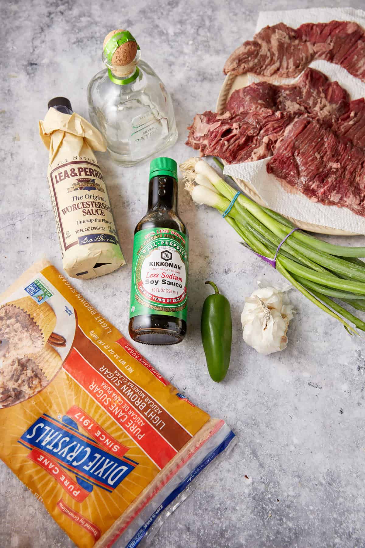 - In a small bowl, whisk together the tequila, Worcestershire sauce, soy sauce, brown sugar, and pepper until well combined. Add the jalapeno, onions, and garlic.