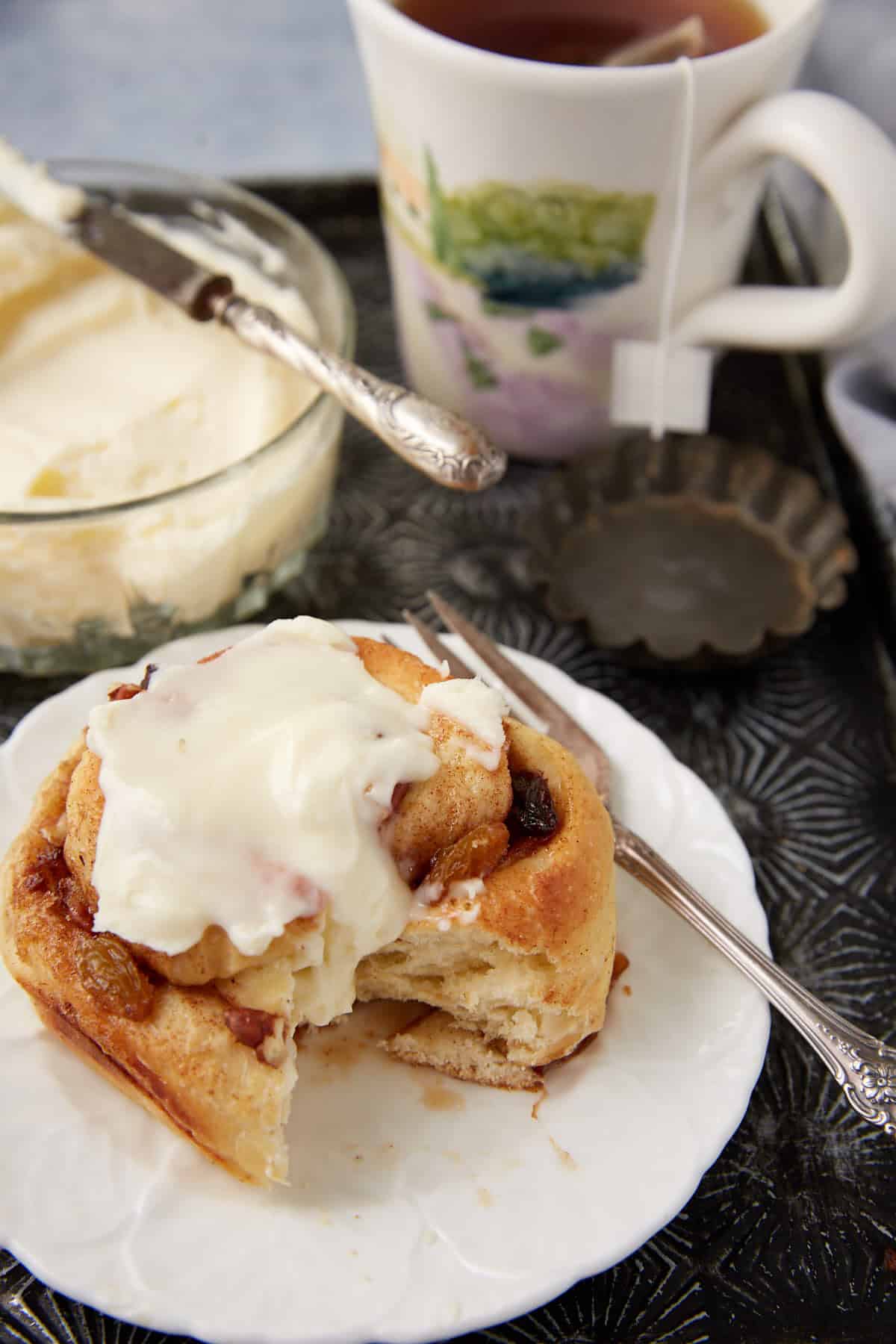 It’s not near as sweet as a frosting for a cake. Since you have a cinnamon sugar filling a more tangy cream cheese frosting works great.