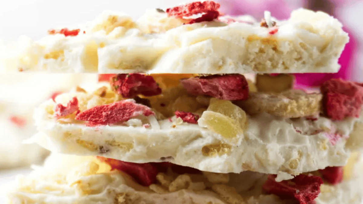 White chocolate bark is a decadent, easy treat loaded with dried pineapple, strawberries, crispy rice cereal and crunchy coconut cookies.