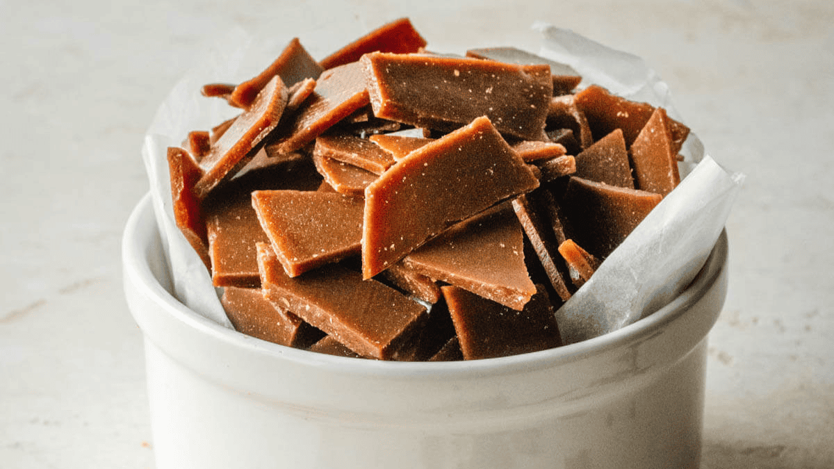 Brown sugar and butter are boiled then poured into a thin layer to harden at room temperature. Break apart into DIY crunchy and buttery homemade toffee bits to use in your baking.