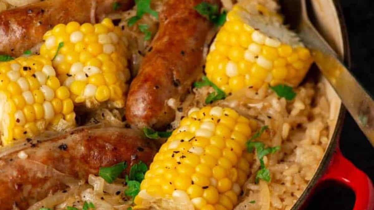 Take a break from chicken and try baked rice seasoned with Italian sausage, vidalia onions and corn on the cob, great for a weeknight meal.