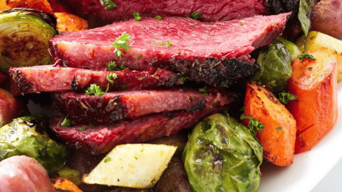 Baked corned beef and vegetables with a caramelized glaze and perfectly roasted potatoes, carrots, and Brussels sprouts. Juicy, flavorful, and easy—no mushy boiled veggies here!