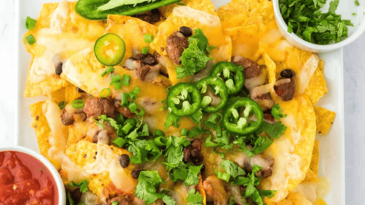 This Steak Nachos recipe with steak, black beans, chunky salsa, crispy tortilla chips, and shredded Monterey Jack cheese is a sure-fire hit.
