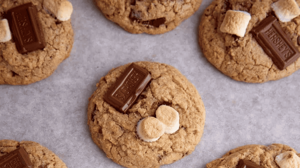 Create a s’more without a campfire in cookie form. Crushed graham crackers are blended into the cookie batter with marshmallows and chocolate on top.