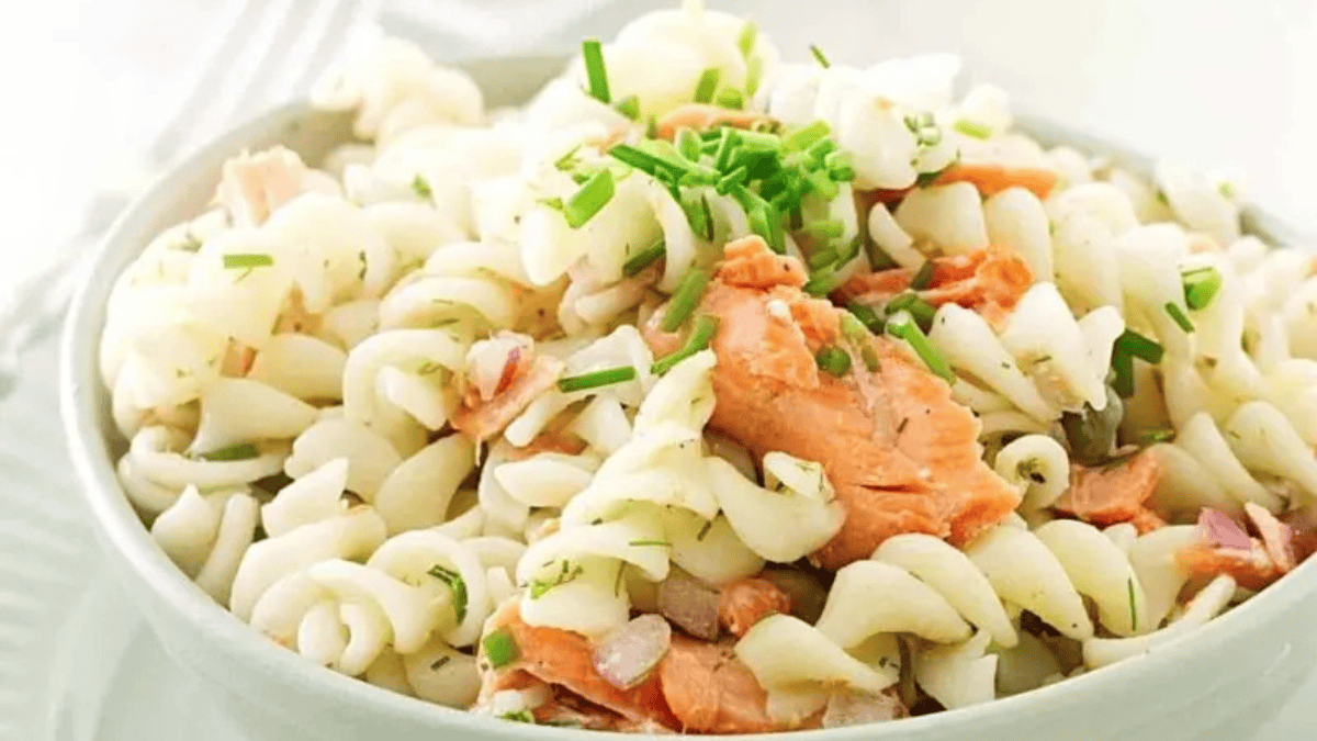 This Salmon Salad with Spelt Pasta is filled with salmon, capers, dill, onions, chives, spelt pasta and tossed with a tangy lemon vinaigrette.
