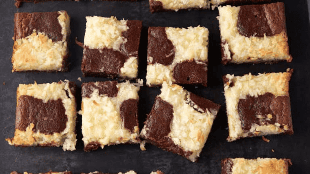 Fudgy brownies with a sweet coconut filling, featuring chocolate, cream cheese, and coconut for a tropical twist on a classic dessert.