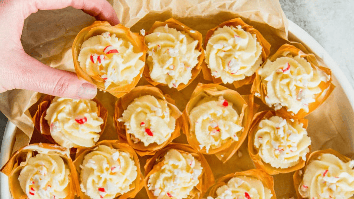 Mini White Chocolate Peppermint Tarts start with phyllo shells filled with a creamy filling, and then topped with whipped cream!