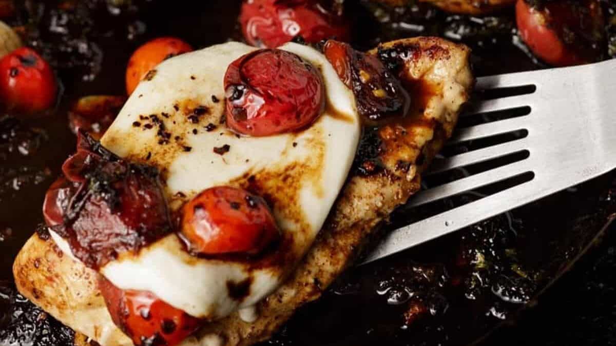 Fresh Mozzarella and Chicken with Balsamic Glaze is simple and easy with tomatoes roasted in a slightly sweetened balsamic glaze.